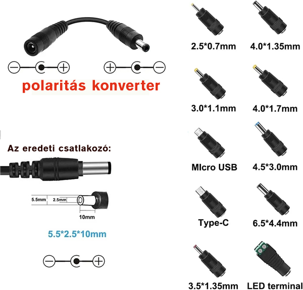 Kimeneti csatlakozó: 5,5 x 2,5 x 10 mm-es jack