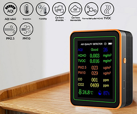 AQI általános légminőség HCHO formaldehid - idődiagramot is rögzít TVOC illékony szerves vegyületek - idődiagramot is rögzít PM (particulate matter)a levegőben lebegő szilárd és folyékony (aeroszol) részecskék gyűjtőneve: PM2,5 a 2,5 mikrométer vagy annál kisebb méretű részecskék összessége. Finompornak is nevezik. Azért különösen veszélyes, mert képes a tüdő mélyére hatolni és ott lerakódni. - idődiagramot is rögzít PM10
